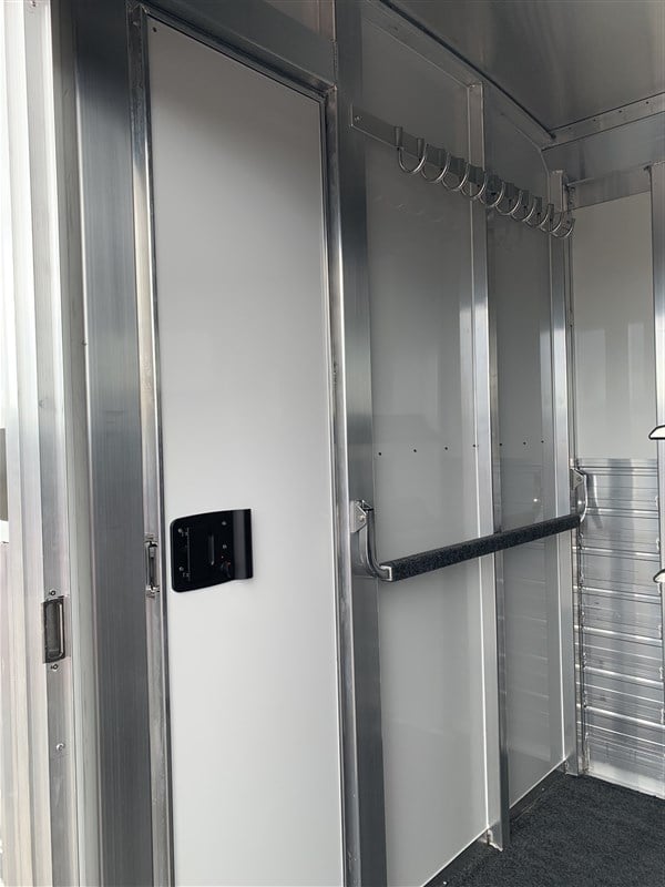 2024 4 Star 2+1 Warmblood. Features include: 7’6″ Warmblood height, 4′ walk in tack room with 2 windows in goose neck nose, 2 tier saddle rack, carpeted tack room, bridle hooks, brush tray, walk through door from horse compartment to dressing room, 60″ fold down rear ramp, dutch doors with slide windows above ramp, exterior load light over rear ramp, fully lined and insulated walls in horse compartment, rubber kick mats on walls, rubber floor mats, 60″ tall side ramp, dutch door with slide window over side ramp, LED load light over side ramp, 2 straight load stalls with warmblood width and length, Quiet Ride butt bars, Quiet ride chest bars, Quiet Ride ROLLING DIVIDER, Quiet ride removable divider and headshield, drop down windows with fold down faceguards at the head of each horse, roof vent over each horse and 2 in box stall, 2 swinging stud doors between box stall and straight load stalls, box stall with side access door and ramp, LED interior dome lights in each stall and box stall, all aluminum 16″ wheels, torsion axles.